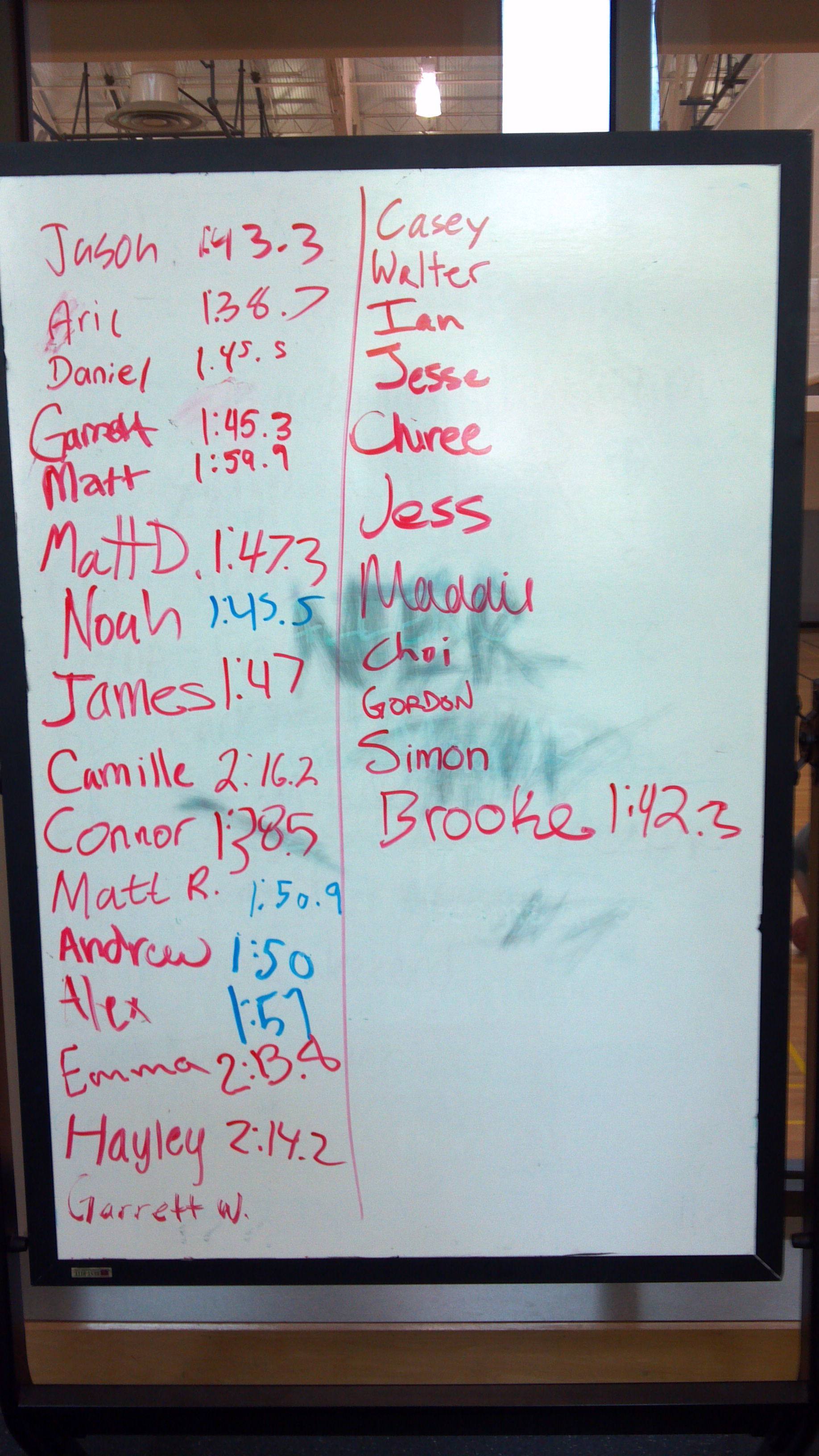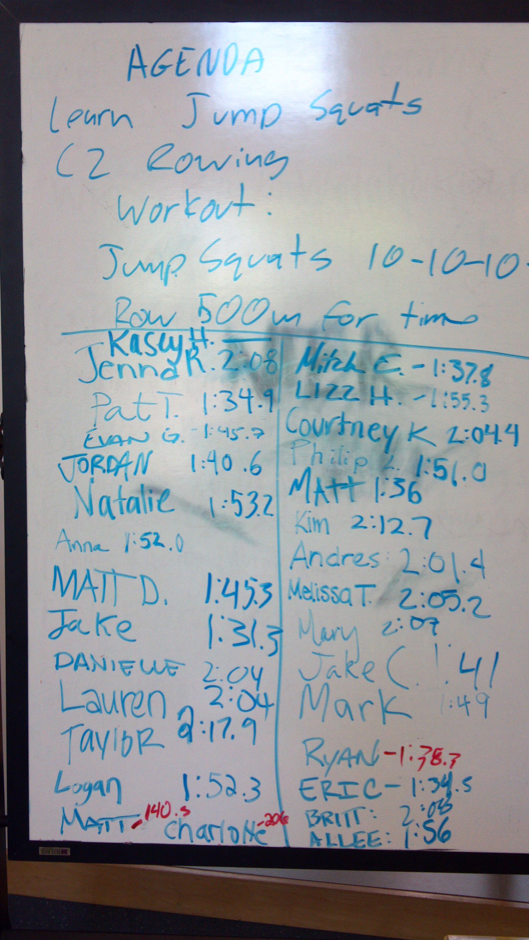 Posted below are your scores from the first day of class. I want to take extra steps with you this term to ensure that you get the most from this class both in performance and knowledge of how to perform the movements we cover in the curriculum and knowledge on how to train on your own outside of this class. Please email me with any questions, or stick around after class and I will do my best to answer them. I look forward to seeing you all progress.